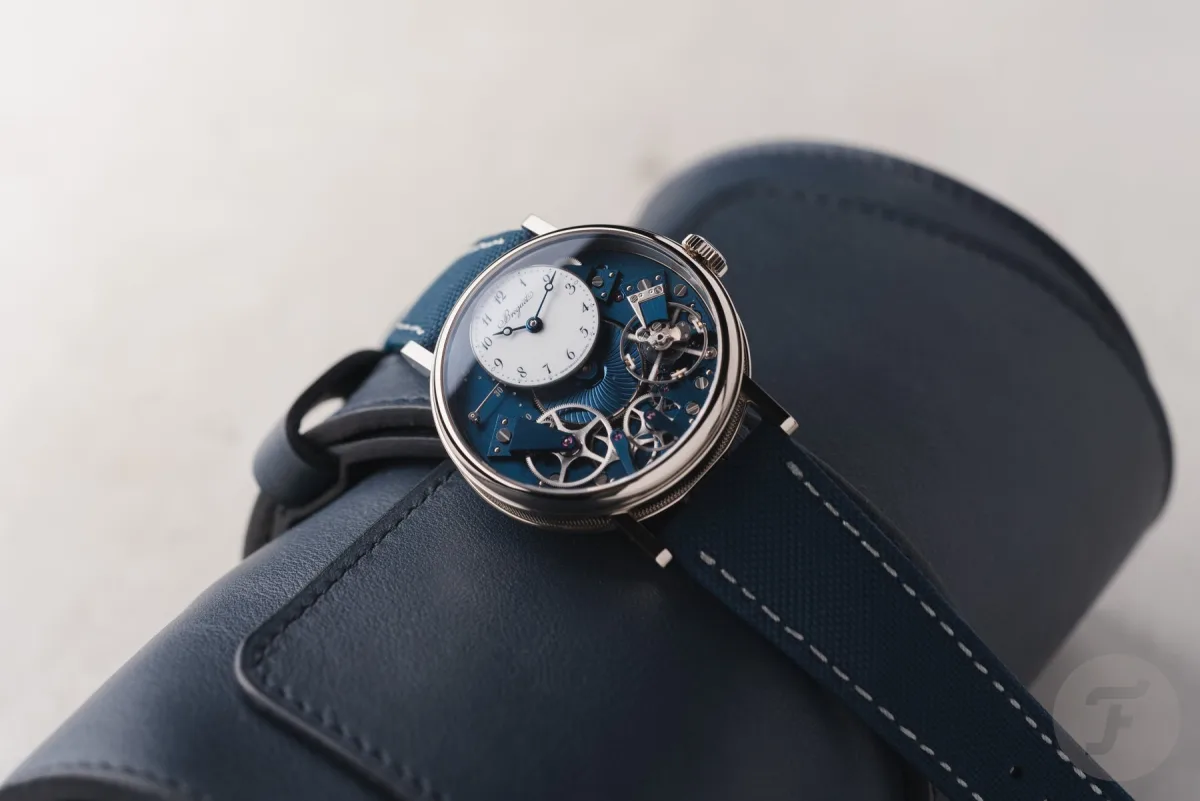 The blue color used in the mechanism is a perfect marine blue. The rhodium-plated movement parts, white gold case, and white enamel dial create a perfect contrast. Breguet pomme hands with open tips are made of blue steel and harmonize with the blue Arabic numerals on the dial. Although many reviews of previous Tradition models and Instagram photos focused on the small dial, as an owner, I have had no issues with legibility. Whether with glasses or without, the time is easily readable.