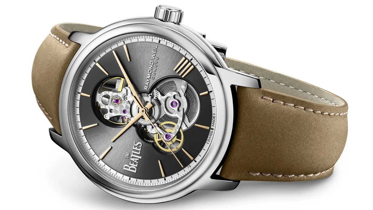However, while the movement's aesthetics may be enhanced, its performance remains the same: a scant 38-hour power reserve at a frequency of 28,800 beats per hour. Raymond Weil complements the watch with a vegan nubuck strap, light brown in color and with a fuzzy texture, reminiscent of John Lennon's iconic coat from The Beatles' last live performance on the rooftop of Apple Corps in London on January 30, 1969.